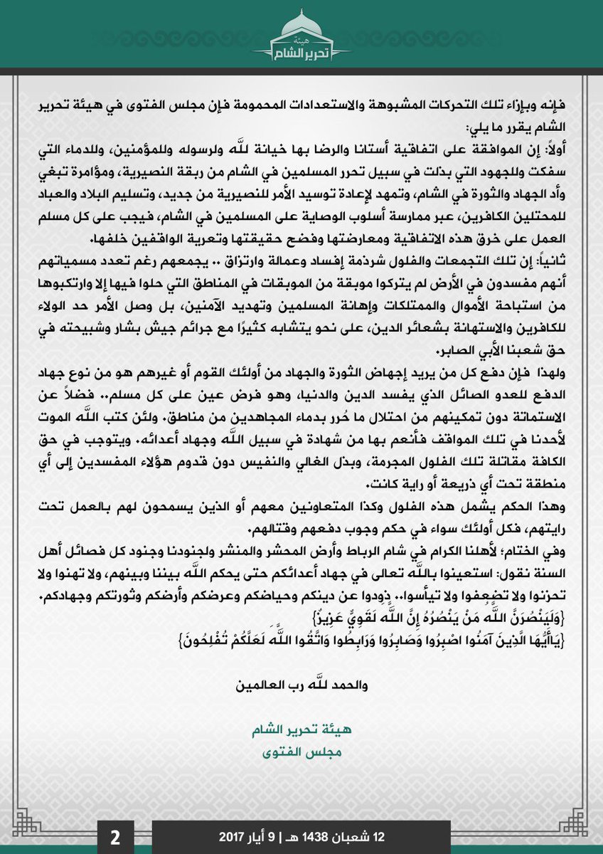 أصدرت هيئة تحرير الشام "جبهة النصرة سابقاً" بياناً أعلنت فيه "موقفها الشرعي من التطورات والمستجدات الأخيرة"، وأفتت "بقتال أي قوة عسكرية تقدم على محاولة دخول محافظة إدلب"، معتبرة ذلك من باب "رد الصيال". وأشار البيان إلى "مسلسل التآمر على جهاد أهل الشام" وآخره مؤتمر أستانة، إلى أنّ "المسلمين لن ينخدعوا بشعارات تخليصهم من القصف التي هي التفاف على ثورتهم". وأضاف بأن الأخبار الواردة للهيئة تفيد بتحركات غير مسبوقة، من قبل من سمّاهم بـ "فلول الفصائل المفسدة سابقاً"، والتي تهدف إلى "التوغل في عمق المناطق المحررة". ونوه البيان، إلى أنه وفقاً لذلك فقد أصدر مجلس الفتوى في الهيئة، أن "الموافقة على اتفاقية أستانة والرضا بها خيانة لله ولرسوله وللمؤمنين"، وأضاف البيان أنه "يجب على كل مسلم العمل على خرق هذه الاتفاقية". وقالت الهيئة إن من يُقتل في المعارك ضد هذه المجموعات فهو شهيد، كونه يحاول منع تسليم الأرض لـ"عملاء مرتزقة". وأضافت أن "هذا الحكم يشمل هذه الفلول والمتعاونين معهم، والذين يسمحون لهم بالعمل تحت رايتهم، فكل أولئك سواء في حكم وجوب دفعهم وقتالهم". وتابعت بأنه والتزاماً بمقررات "أستانة"، يستعد قادة هذه الفصائل إلى استغلال الفرصة، والانقضاض على المناطق "المحررة"، متهماً إياهم بالولاء لمشاريع دخيلة.