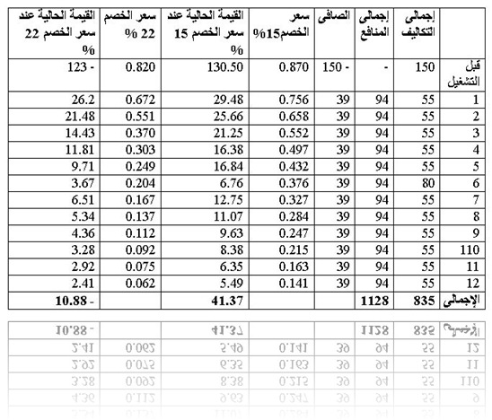 كما فى جدول( 1 ) يوضح العمود الأول عمر المشروع ثم عمود التكاليف الاستثمارية وتكاليف الإنتاج وتكاليف التشغيل وعمود إجمالى التكاليف حيث تجمع فيه تكاليف كل سنة – ثم يختار سعر الخصم المناسب حسب ما ذكر سابقا ويكتب بيانات سعر الخصم فى العمود الخاص به ثم تحسب القيمة الحالية للتكاليف كل سنة بضرب تكاليف السنة فى سعر الخصم المقابل لكل سنة وتجمع إجمالى القيمة الحالية للتكاليف ، ثم تحسب منافع المشروع وتجمع العوائد وتوضع فى عمود إجمالى منافع المشروع – وتخصم منافع كل سنة بنفس سعر خصم التكاليف . وتحسب القيمة الحالية للمنافع . ثم تحسب مقاييس الجدوى للمشروع .