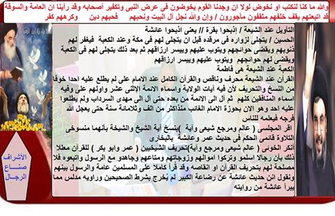 ومنها قول أحد الأئمة فى (الكافي) .نور الطبرسى . المجلسى .. القمى .. الخوئى ..الطوسي...الكولينى ...( بحار الأنوار)0000 وهم عندهم مثل البخاري ومسلم عندنا،فهم من الثقات الصحاح ( يقول أئمة آل البيت في تفسير الشرك بالله الشرك عندنا نحن آل البيت هو من أشرك غيرنا في أمرنا (يقصد أمر الإمامة ) وهذا التأويل باطل لأنه ذهب بالمعنى الظاهر للشرك إلى المعنى الباطن الذي لا يخبر به إلا وحى من السماء ، وقولهم فى نفس المصادر والمراجع ( أن عمر بن الخطاب ذهب إلى على بن أبى طالب واخبره بجمع القرآن وطلب من (الإمام على ) ما عنده من مصحف ليجتمع عليه المسلمين فقال (الإمام على ) والله لن أعطيه لك لأنه لا يمسه الا المطهرون ويقصد بهذا ان عمر مشرك ونجس ولا يؤتمن على القرآن ) وكلا وحاشى ان يقول باب مدينة العلم هذا القول وان قاله فقد باء بغض من الله لأنه ترك الامة تتلوا مصحف ناقص يتعبدون به ويضلون عن سبيل الله وكيف سمح على لعمر وهو المشرك غير المؤتمن بخلافة المسلمين وإمارتهم وهو قابع فى بيته كالنساء يرى دين الله ينتهك وكتاب الله بين يدى المسلمين منقوص ومحرف وفى الكافي أيضا يقول ولما تولى أبو بكر الصديق الخلافة واستبطأ على في البيعة ذهب إليه أبو بكر الصديق رضي الله عنهم هكذا يقول الشيعة فى كتبهم وقال له لم تأتى لتبايعني أكاره لبيعتي يا على قال الإمام على رضي الله عنه وعليه السلام لا والله يا أمير المؤمنين ولكن عكفت على كتاب الله لأكتبه واجمعه فقال أبو بكر الصديق بوركت يا على هذه الرواية موجودة فى كتبهم صحيحة وخاصة الكافى ( بخارى الشيعة ) وهذا إقرار باعتراف على بخلافة أبو بكر وان كان هذا ليس موضوع البحث............... ثم لقي كل من طلحة والزبير وغيرهما الإمام على ( اصول الكافى ) وقالوا له لما لم تعطى ما جمعت لأبى بكر وعمر فقال الإمام على لأن فيه أسماء المنافقين كلهم وفية آيات ولايتنا نحن آل البيت وفيه ذكر أسماء الأئمة الإثنى عشر وأنا أولهم فإن أعطيته لعمر وأبى بكر نسخوها وأخفوها ) ....وهنا أوقع الشيعة الإمام على في شرك عظيم وربما كفر بين لأنه اخفي ما انزل الله ولم يبلغ ما انزل الله وأنكر حفظ الله للقرآن وترك المسلمين ضحية المنافقين وهم لا يعلمون لأن القرآن محبوس عند الإمام على وهم لا يعلمون المنافين لأنهم غير مذكورين إلا في مصحف على كما أنه وكأن آيات المنافقين وأسماءهم لم يقرآها رسول الله إلا على الإمام على فقط دون غيره لذلك جهل الصحابة والمسلمين أسمائهم وكأن أسماءهم اعز عند رسول الله والإمام على من أبى لهب عم الرسول الذي انزل فيه قرآن يبشره بجهنم وأعز من أبى طالب عم رسول الله ووالد على ابن أبى طالب ولم تنزل فيه آية قاطعة مانعة تبشره بالجنة أو تخبرنا بإسلامه وهو من هو بالنسبة لرسول الله وما فعله مع محمد صلى الله عليه وسلم لا يرتدى عباءته إلا مؤمن وموحد بالله من حماية وكفاية رسول الله ( كلا وحاشى أن يكون الإمام وآل بيته هكذا) وإذا كان القرآن الكريم منقوص وصحيحة مع الإمام على الذي ورثه للأئمة صلوات الله عليهم حتى وصل إلى مهدي السرداب واختفى به يحتفظ به لنفسه حتى موعد خروجه فكيف يحاسب الله من ماتوا قبل ظهور المهدي واى حجة تقام عليهم وما بين أيديهم من قرآن منقوص ومحرف واى ذنب يحاسب عليه الإمام على وآل بيته والأئمة اكبر من إخفائهم للقرآن الصحيح تاركين الأمة في ضلال وما صحة ذلك من قوله صلى الله عليه وسلم ( تاركا فيكم ما إن تمسكتم به لن تضلوا بعدى أبدا كتاب الله وعترتى وفى رواية أخرى وسنتي ) فأين كتاب الله الذي تركه رسول الله وأين العصمة من الضلال وكتاب الله لم يترك بين ايدى المسلمين وكيف نرجع للعترة والسنة وليس بين ايدينا كتاب الله الصحيح ولا بين أيدهم حتى الآن لأنه فى عصمة مهدي السرداب ولا يعلمون عنه شيئا (يا ايها الرسول بلغ ما انزل اليك من ربك وان لم تفعل فما بلغت رسالته والله يعصمك من الناس ان الله لا يهدي القوم الكافرين) في الكافي احد تلاميذ الإمام ابى عبد الله يقول له لقد قرأت الآية كما سمعتها منك فينهره الإمام ويقول له اقرآها كما