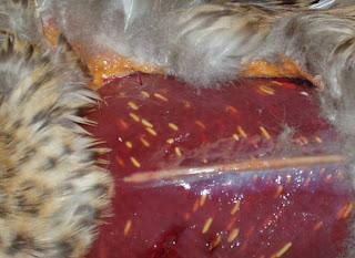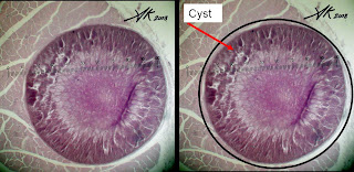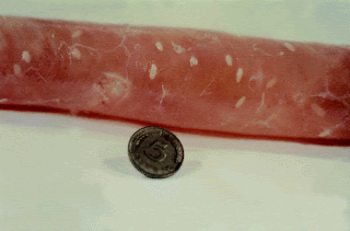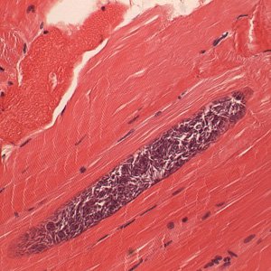 1- الفحص النسيجي للعضلات ميكروسكوبيا حيث يلاحظ أن الحويصلة تتركب من جدار خارجي ذو بنية خاصة ومقسمة بحواجز إلى حجيرات وتحتوي على عدة آلاف من البراديزويت . و هذه صورة لحويصلة مصبوغة بصبغةH&E