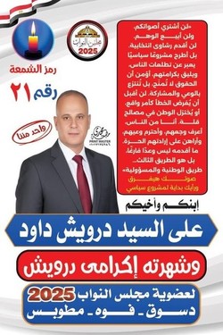 يا أهالى شباس الملح،موعدنا يومَى الإثنين،والثلاثاء24،و25نوفمبر2025م،بإنتخابات مجلس النواب2025،الجولة الأولى بالداخل،للمرحلة الثانية،دائرة دسوق،فوة،مطوبس،إعطى صوتك لنائب عادل محمد النجار،رقم 1،ورمز القلم،وشيخ البرلمان عمى سيد أحمد عيسى،رقم25،ورمز الغزال،والوجه الجديد،الطموح،الأستاذ على السيد درويش داوود،رقم 21،ورمز الشمعة .