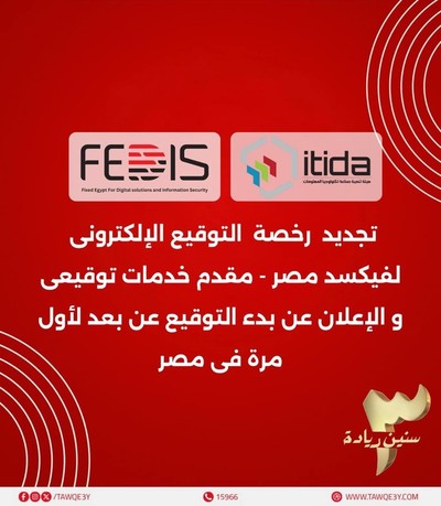 في خطوة تعكس ثقة الجهات التنظيمية في كفاءتها وريادتها، أعلنت شركة FEDIS – فيكسد مصر للحلول الرقمية وأمن المعلومات، المشغّل الرسمي لمنصة "مصر الرقمية"، عن تجديد رخصتها الرسمية لمزاولة نشاط تقديم خدمات التوقيع الإلكتروني، بعد حصولها على شهادة التصديق الإلكتروني من هيئة تنمية صناعة تكنولوجيا المعلومات "إيتيدا"، الجهة المختصة بتنظيم القطاع، وفقًا لأحكام القانون رقم 15 لسنة 2004، وفقاً لبيان رسمي صادر عن الشركة.