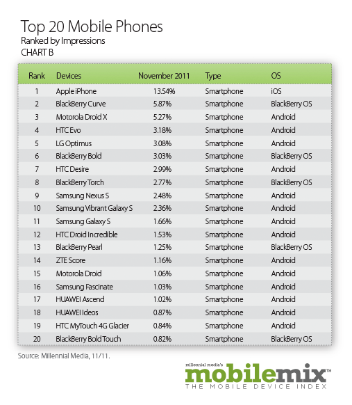 Apple’s iPhone remained the top device in Millennial’s November report, growing its share from 12.53% in October to 13.54% last month. RIM’s BlackBerry Curve line jumped up to the No.2 position with 5.87% and Motorola’s DROID X inched down one spot with 5.27%.