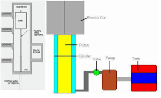 فكرته الاساسيه فى ضغط الزيت بقوه كافيه فى انبوب او اسطوانه يعمل على رفع العربه لأعلى وسحب الزيت من الانبوب يعمل على نزول العربه لاسفليستخدم الهيدروليك فى تحريك اوزان خفيفه ومتوسطه لمسافات قصيرة نسبيا لا تتعدى مسافه ارتفاع ٧ طوابق وبسرعه عاديه حتى لا يكون هناك حمل كهربى زائد على محرك الضخ لفترات طويله فيعجل من اتلاف الملفات الداخليه للمحرك وتوجد غرفه التحكم والمضخه بالاسفل دائما