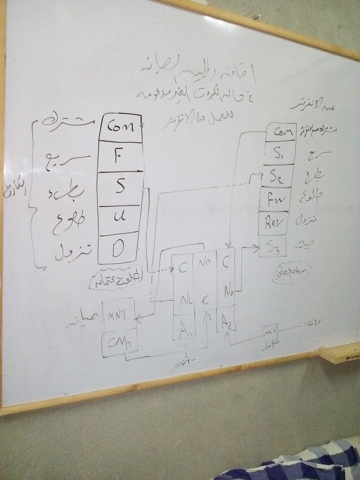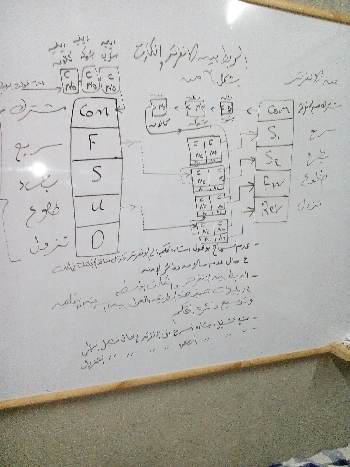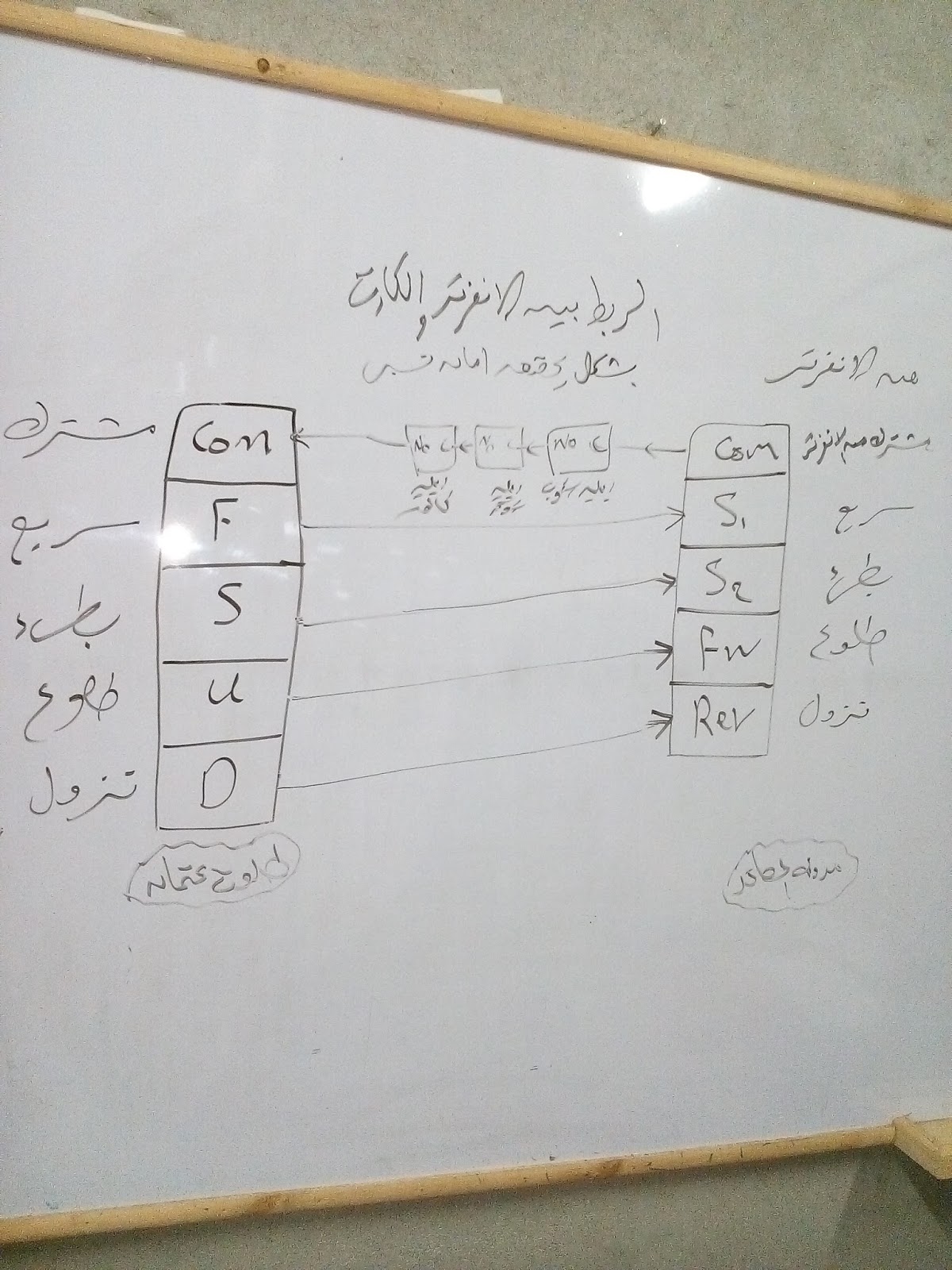 وفى النهايه يمكن تصور طريقه الربط بين منافذ التحكم فى الانفرتر ومنافذ كارت المصعد فى وضعى الصيانه والوضع الطبيعى كما يظهر فى الشكل التالى على السبورة.