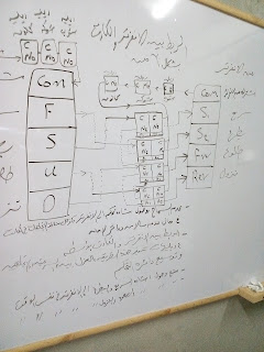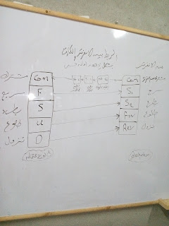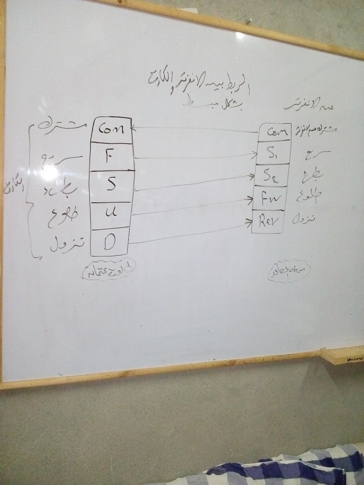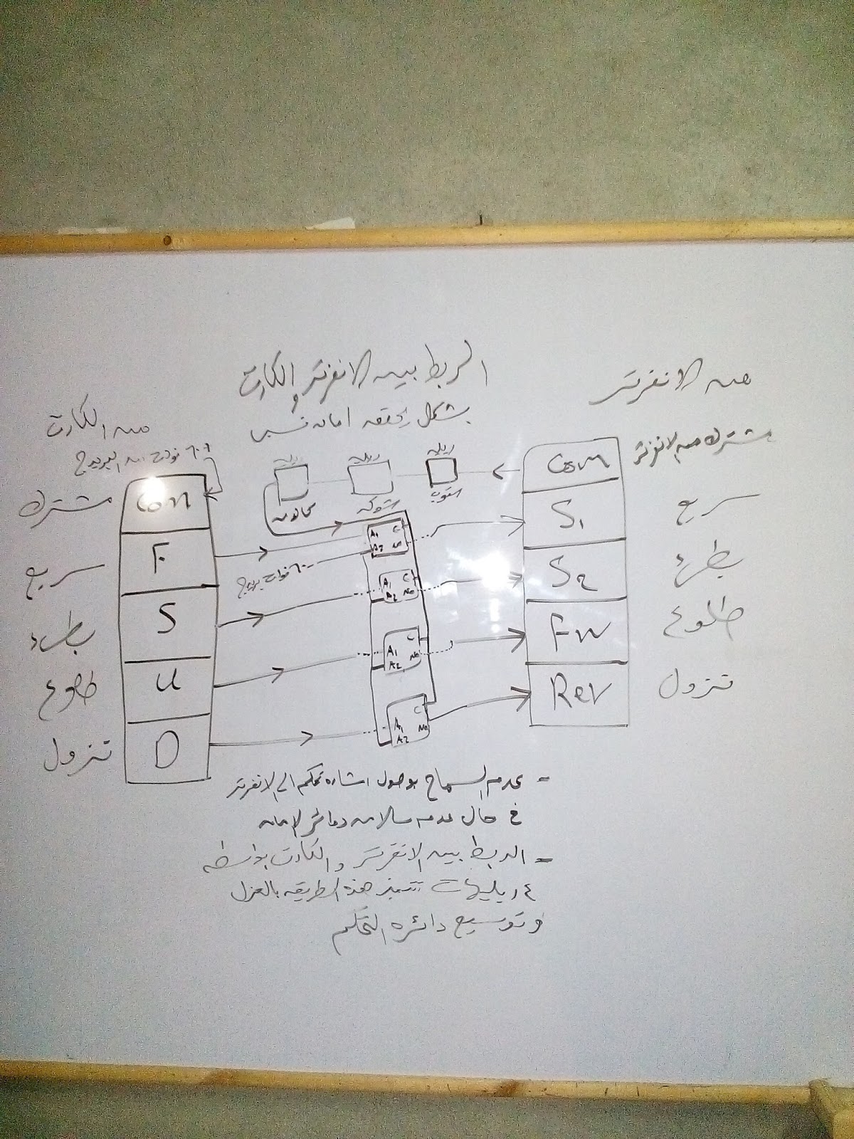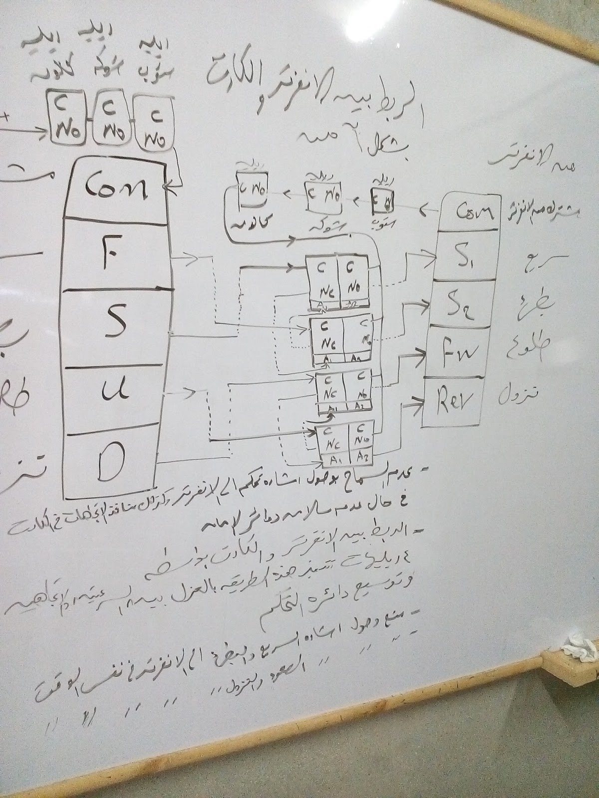 وفى النهايه يمكن تصور طريقه الربط بين منافذ التحكم فى الانفرتر ومنافذ كارت المصعد فى وضعى الصيانه والوضع الطبيعى كما يظهر فى الشكل التالى على السبورة.