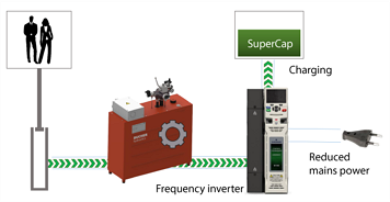 تقوم بتغيير تردد تغذية المحرك فى اتجاه الصعود لتعطى اقلاعا ناعما ويبدأ تدفق الزيت مباشرة بعكس طريقة نجمه/مثلث التقليدية التى تستغرق من 2-3 ثانية بدون ارتداد للزيت سواء فى الاقلاع أو التباطؤ مما يقلل من مسببات تسخين الزيت كما انها تخفض من زمن الرحلة بشكل عام نتيجة قلة ازمنة مراحل التسارع والتباطؤ والتوقف وتخفض ايضا من استهلاك الطاقة هذا وقد ادت تقنية مغيرات التردد الى تغيير فى حدود السرعة للمصاعد الهيدروليكية حيث اصبحت تقاد بسرعة مرتفعه تناسب تشغيلها فى المطارات ومحطات القطارات والمراكز التجارية