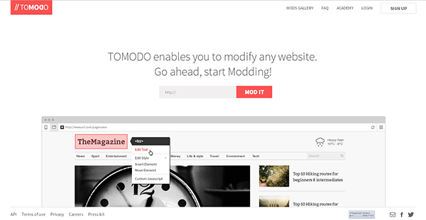 tomodo خدمة تمكنك من تعديل أي موقع عن طريق تغيير النص، تحرير النمط، وإدراج العناصر، وإدراج أكواد مخصصة من جافا سكريبت مخصصة ،ويمكن أن ترى النتيجة مباشرة ،يعني في الوقت الحقيقي. أنت لا تحتاج إلى أي إذن من الموقع الفعلي. هذه الخدمة ستكون مفيدة خاصة لمحبي تطوير المواقع .