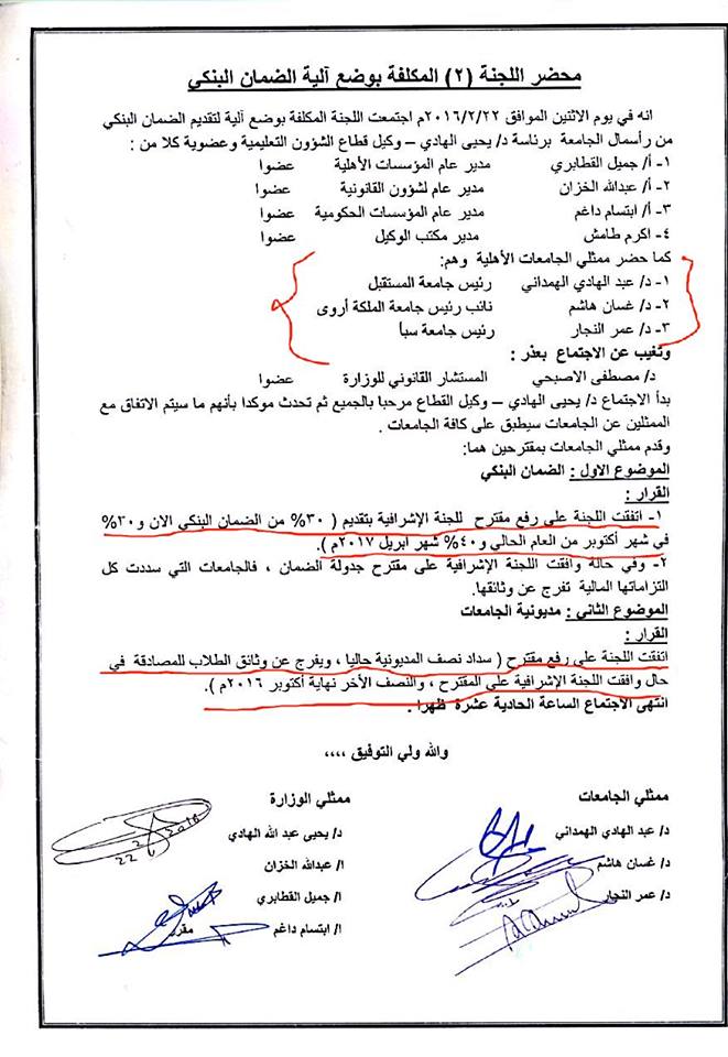 وكشفت وثيقة رسمية صادرة عن وزارة المالية عن جريمة اهدار للمال العام والاضرار بمصلحة الدولة واستغلال الوظيفة العامة لتحقيق منافع ومصالح شخصية في وزارة التعليم العالي والبحث العلمي التي تعد وزارة غير إيراديه.حيث اضطرت وزارة المالية لتشكيل لجنة كبيرة من المالية والجهاز المركزي للرقابة والمحاسبة للنزول إلى الوزارة والجامعات الأهلية لتحصيل المديونية المستحقة للخزينة العامة للدولة والتي سبق أن قدمت الجامعات تعهدات بسدادها بشكل نهائي في موعد اقصاه شهر ابريل من العام 2017م كحد أقصى وقام وزير التعليم العالي والبحث العلمي حسين حازب بإصدار توجيهات مباشرة بإلغاء الضمانات واعفاء الجامعات الأهلية من الوفاء بالتزاماتها المالية المستحقة للخزينة العامة للدولة.حيث كشفت الوثائق أن توجيهات الشيخ حازب أدت إلى الحاق ضرراً كبيراً بالمال العام والتقصير العمدي والتهاون والتواطئي في تحصيل قرابة 4 مليار ريال كان يجب أن تدخل إلى خزينة الدولة قبل 30 ابريل 2017م بحسب محاضر اتفاق ملزمة وموقعة مع الجامعات الاهلية .وتتمثل تلك المبالغ بمديونية الرسوم المستحقة عن منح التراخيص وتجديدها للجامعات الأهلية وكذلك رسوم فتح مكاتب التنسيق وفروع لجامعات عربية وأجنبية بالإضافة إلى الغرامات المستحقة للدولة مقابل مخالفات الاعلان عن التسجيل والقبول في برامج غير مرخصة وكذلك ممارسة العملية التعليمية قبل الحصول على التراخيص القانونية وفتح مكاتب للتعليم عن بعد في الداخل والخارج بالمخالفة للقانون بالإضافة الى الضمانات البنكية المنصوص عليها في القانون والبالغة قرابة 2 مليار ريال .وتكشف الوثائق أن توجيهات حازب المخالفة للقانون أعفت أحدى الجامعات الأهلية الخاصة (ج – ع – ت) وأكبر جامعة أهلية في اليمن من رسوم وغرامات مستحقة للدولة تصل إلى مليار ريال .وبحسب مصادر في الشئون المالية في الوزارة اكدت أن صفقة ابرمها نائب مدير مكتب الوزير علي عبدربه حازب مع الجامعة حصلت الجامعة بموجبها على توجيهات صريحة من الوزير حازب بإطلاق وثائقها ومنحتها فرصة للتنصل من التزاماتها وأهدرت احد اهم الضمانات التي كانت تمثل ورقة ضغط قانونية تجبر الجامعة على الوفاء بالتزاماتها المالية للدولة.و نبهت المصادر الى ان قرار وزير المالية بتشكيل لجنة موسعة لهذا الغرض جاء بعد تلقيها بلاغ من الإدارة المالية وقطاع الشؤون التعليمية في وزارة التعليم العالي ، ولفتت المصادر الى ان الوزير حازب هدد بطردها من الوزارة واعتبرها تدخل سافر من وزارة المالية بشئون وزارته؟!وحذرت تلك المصادر من استمرار هدر موارد الدولة ونهبها من هوامير الفساد في حكومة الإغراق وبصفقات فساد مكشوفة مع المتنفذين وعصابات المصالح تحت ضوء الشمس طالما والفساد منظومة متكاملة محمية بمراكز نفوذ وقوانين مقيدة وهيئات رقابية معطلة غارقة بالفساد حتى أذنيها.