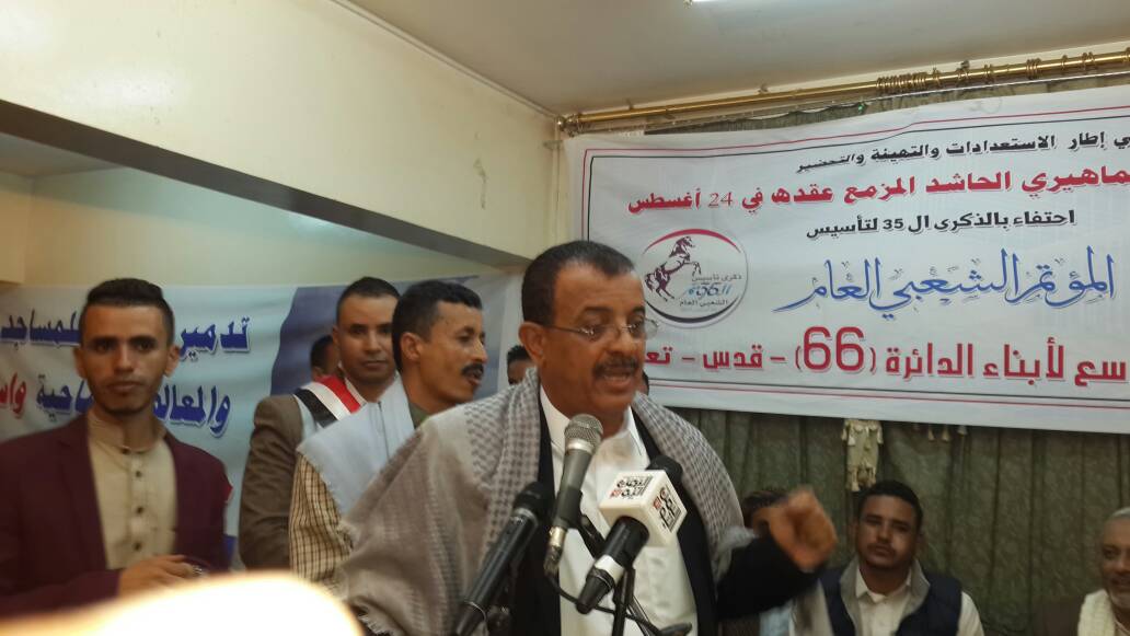 وقال أن هذا الجمع الحاشد المميز لأبناء قدس سيحشد ليوم 24 أغسطس المقبل أضعاف اضعافه، مؤكدين أن حشدنا بذكرى التأسيس سيكون حشدا وطنياً بامتياز.، وسيكون بمثابة رسالة للداخل تؤكد حفاظنا على الجبهة الداخلية وهو رسالة للخارج والعالم أجمع نقول لهم هذه الحشود هي الشرعية الحقيقة للشعب وليست شرعية الفار هادي الذي من أجله قتلتم وفتكتم ودمرتم اليمن أرضا وانسانا.