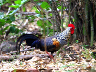 Neck feather's erect and head and beak lowered, jiggling it slightly up and down, this is the male cock's way of making himself look intimidating to his opponent, oh how the Ancient people must have felt watching as two Jungle fowl males clash, fly and claw at each other on and on and on until one tries to run away bloodied and humiliated.