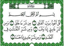 {قُلْ أَعُوذُ بِرَبِّ الْفَلَقِ. مِن شَرِّ مَا خَلَقَ. وَمِن شَرِّ غَاسِقٍ إِذَا وَقَبَ. وَمِن شَرِّ النَّفَّاثَاتِ فِي الْعُقَدِ. وَمِن شَرِّ حَاسِدٍ إِذَا حَسَدَ}