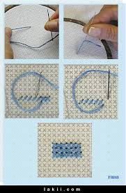 1- يلضم الخيط في الإبرة ويبدأ العمل من اليمين إلى اليسار.