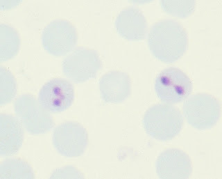 | Bovine, blood smear. Two erythrocytes contain pairs of ovoid Babesia bovis. |