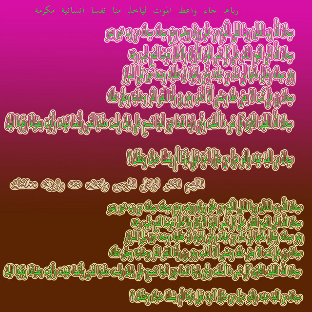 قل ان صلاتى ونسكى ومحياى ومماتى لله رب العالمين انى عبدالله اتانى الكتاب وجعلنى مباركا اينما كنت واوصانى بالصلاة مادمت حيا اذا مات ابن ادم انقطع عمله الا من ثلاث : ولد صالح يدعوا به وعلم ينتفع به والثالثة انتم اعلم بها لاتباغضوا ولا تحاسدوا ولا تدابروا ولا تقاطعوا وكونوا »