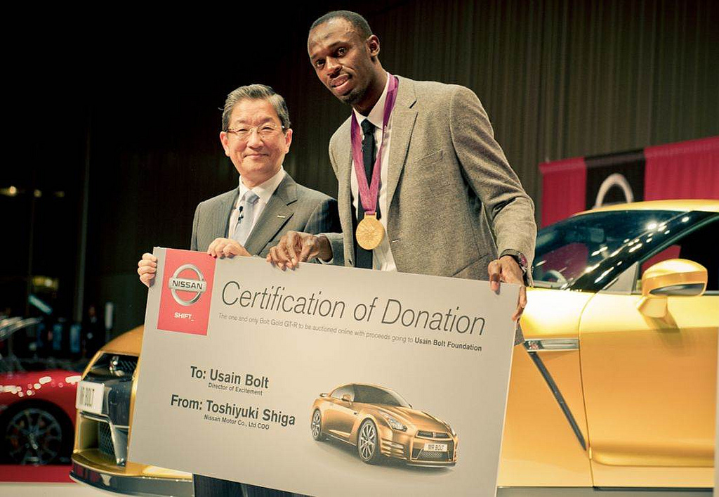 وقد تعاون يُوسَين بولت مع نيسان في يونيو 2012 ليكون سفير العلامة التجارية، وأصبح مؤخراً "مدير الإثارة" للمبادرة التسويقية العالمية الجديدة التي أطلقتها الشركة (“What IF_”). وكجزء من هذه الشراكة الموسعة مع بولت، تجهز نيسان نسخة فاخرة وخاصة من جي تي – آر موديل 2013 "Bolt Gold" استعداداً للمزاد الخيري، وستشمل هذه النسخة على صفيحة الاسم الذهبية وعليها توقيع يُوسَين بولت. وسيتم تصنيع السيارة بمواصفات الأداء حسب قوانين الدولة التي يعيش فيها الفائز بالمزاد، كما ستقوم نيسان بايصال السيارة للفائز المحظوظ في مارس 2013.