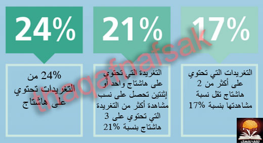 5. التويتات التي تحتوي على هاشتاج تنتشر اكثر اذا وضعت هاشتاج واحدة او اثنتين في جملتك على تويتر يمكن ان تزيد معدل مشاهدتها بنسبة 21% ولكن لانها سوف توصل جملتك لاكثر من مكان ولكن لا يجب ان تزيد منها لانها ستعد نقطة سلبية