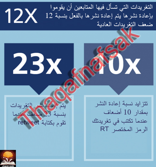 9. إذا طلبت من المتابعين أن يقوموا بإعادة نشر ما قمت بنشرة على تويتر يزداد نسبة نشره 23 ضعف المعتاد: هذه النقطة بالذات تعد جديرة بالإهتمام خاضة أن الكثير منا قد يشعر بالكسل من إعادة نشر تويتة معينة ولكن إن طلبت قد تنمي لديه الرغبة في ذلك