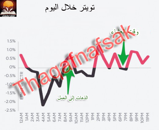 7. الاستخدام الكثيف لتويتر خاصة اوقات الذهاب الى العمل عندما تكتب تويتة يجب ان تفكر في مشاهديك وماذا يفعلون. فان كانت في الصباح فهم يذهبون عادة الى اعمالهم وفي الحقيقة هذا الوقت هو افضل وقت لتجعلهم يتابعوك فهم عادة ما شيعرن بالملل ويحاجون ما يسليهم ، وتخيل ان نسبة الزيادة في استخدام تويتر في هذه اللحظة اكبر بنسبة 119% لذلك يجب ان تهتم بالمحتوى الذي تقدمه في هذه الفترة اما وقت العشاء فهو اسوا الاوقات التي يمكنك ان تحصل فيها على المتابعين