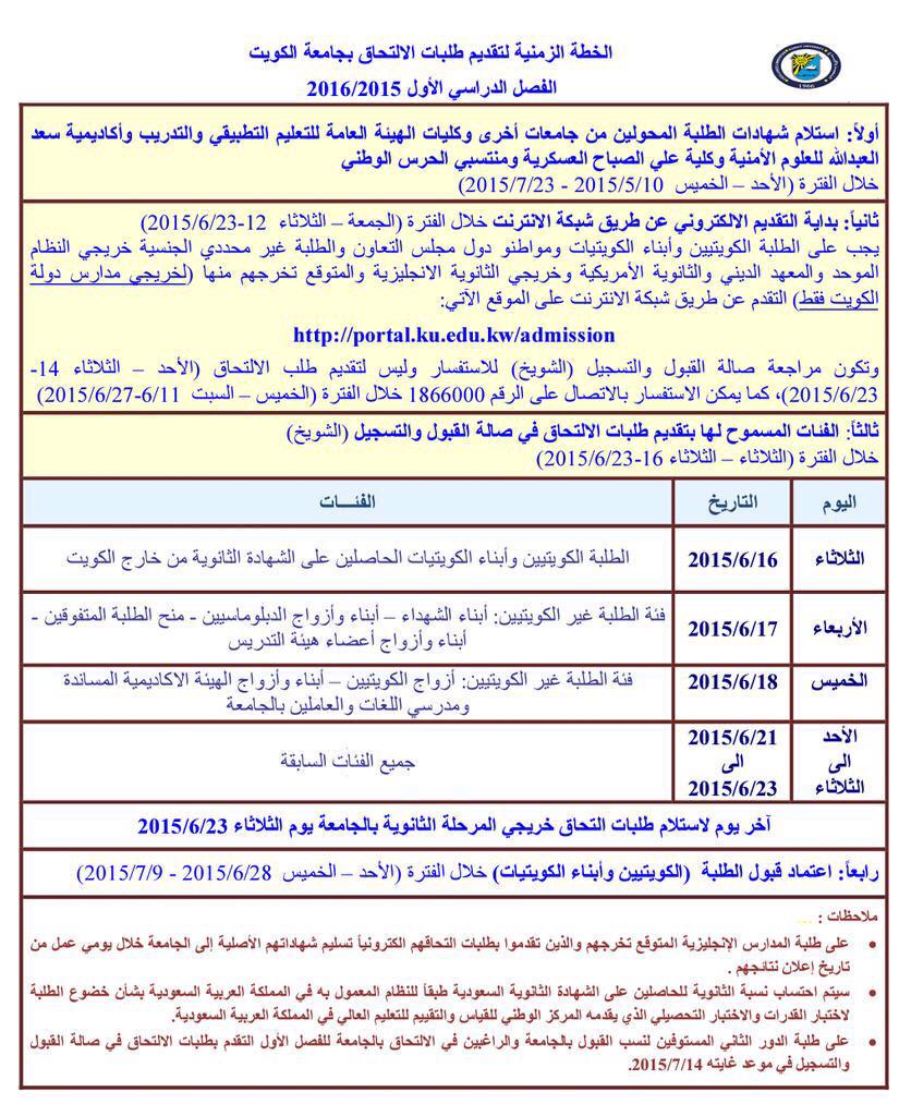 الخطة الزمنية لتقديم طلبات الالتحاق بجامعة الكويت الفصل الدراسي الأول 2016/2015 pic.twitter.com/zetAYxAYnh