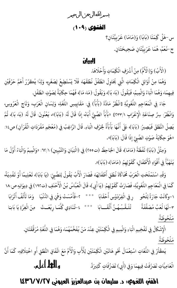 س. هل كلمتا (بابا) و(ماما) عربيتان؟ ج. نعم، هما عربيتان صحيحتان. والتفصيل في الصورة: