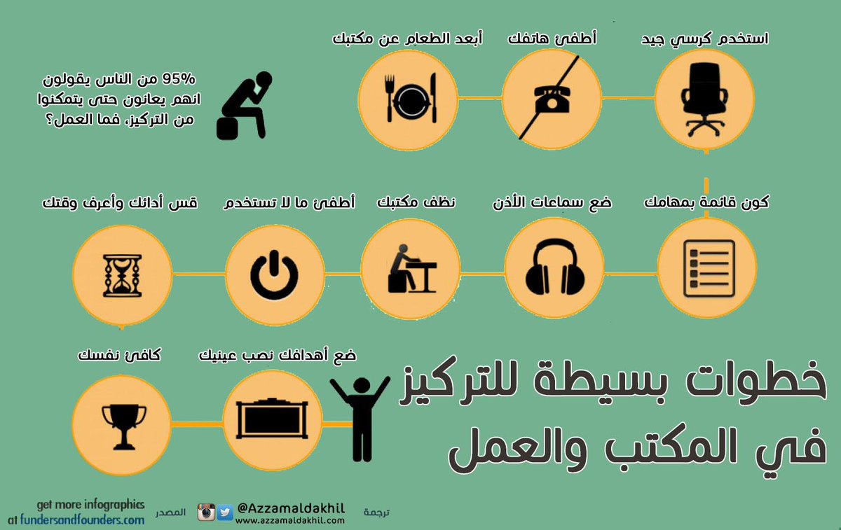 #انفوجرافيك خطوات بسيطة للتركيز في المكتب والعمل #بيئة_العمل Via @AzzamAlDakhil