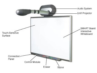 مكونات السبورة الذكية:تتكون السبورة الذكية من لوحة تفاعلية بيضاء، تشتمل على أربعة أقلام إلكترونية ومساحة إلكترونية، يتم توصيلها بالكمبيوتر وبجهاز الملتيميديا بروجكتر، وفي حالة الرغبة في استخدام برامج التواصل يمكن تركيب كاميرا ويب Webcam مع الكمبيوتر على اللوحة الذكية.