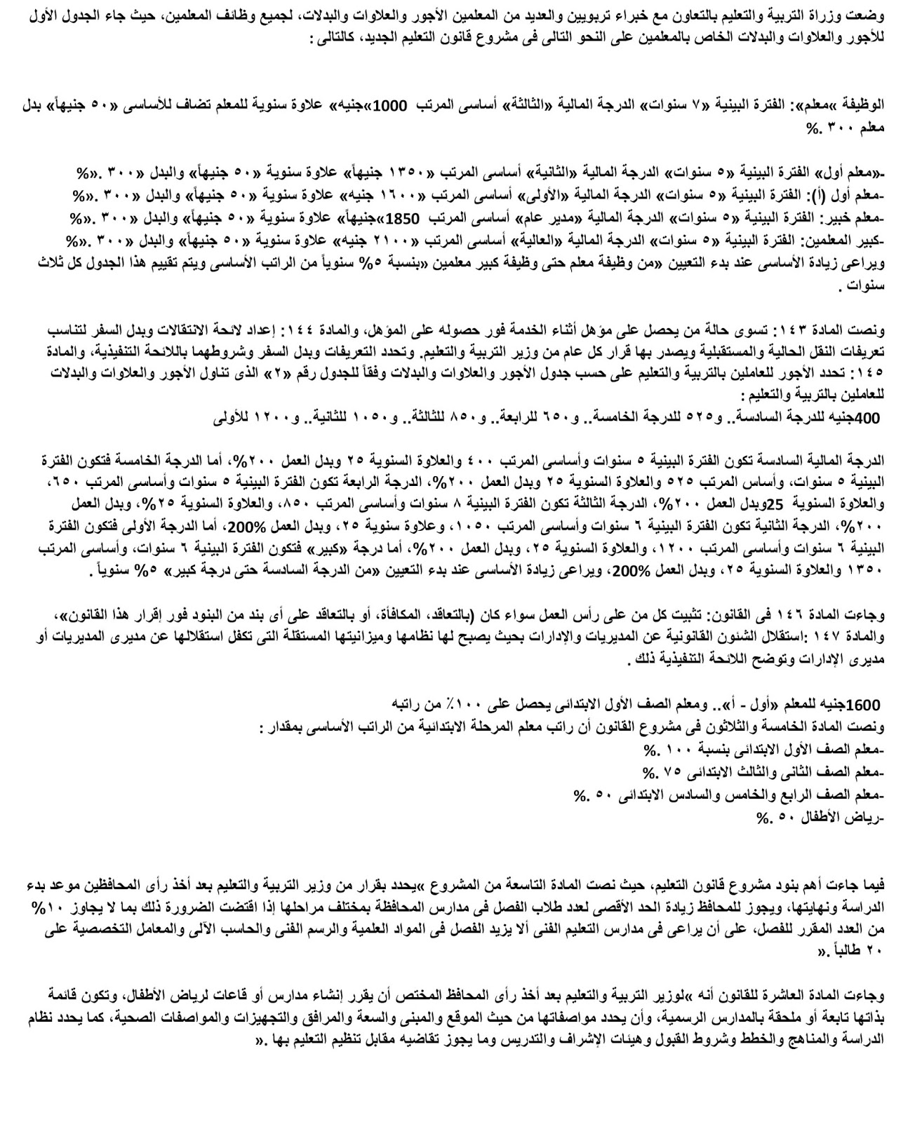 معلم أول (أ): الفترة البينية «5 سنوات» الدرجة المالية الأولى أساسي المرتب «1600 جنيه» علاوة سنوية «50 جنيهاً» والبدل 300%