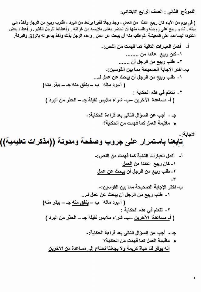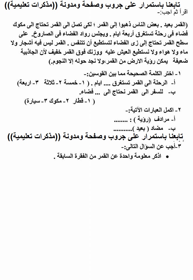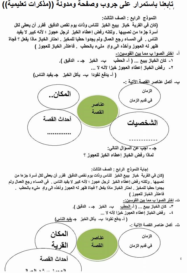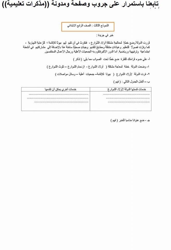 قرائية : نماذج للتدريب على السؤال الخارجى من القراءة المتحررة المحتوى للتدريب عليها للصفين الثالث والرابع الابتدائي
