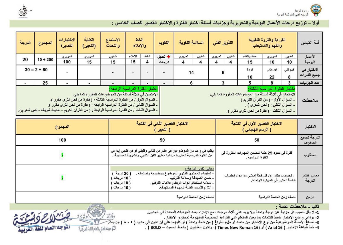 توزيع درجات الأعمال اليومية والتحريرية وجزئيات أسئلة اختبار الفترة والاختبار القصير للصف الخامس لمادة اللغة_العربية
