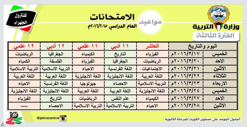 جدول امتحانات الفترة الدراسية الثالثة 2016/2015 للمرحلة الثانوية - شكرًا لكنترول الجهراء