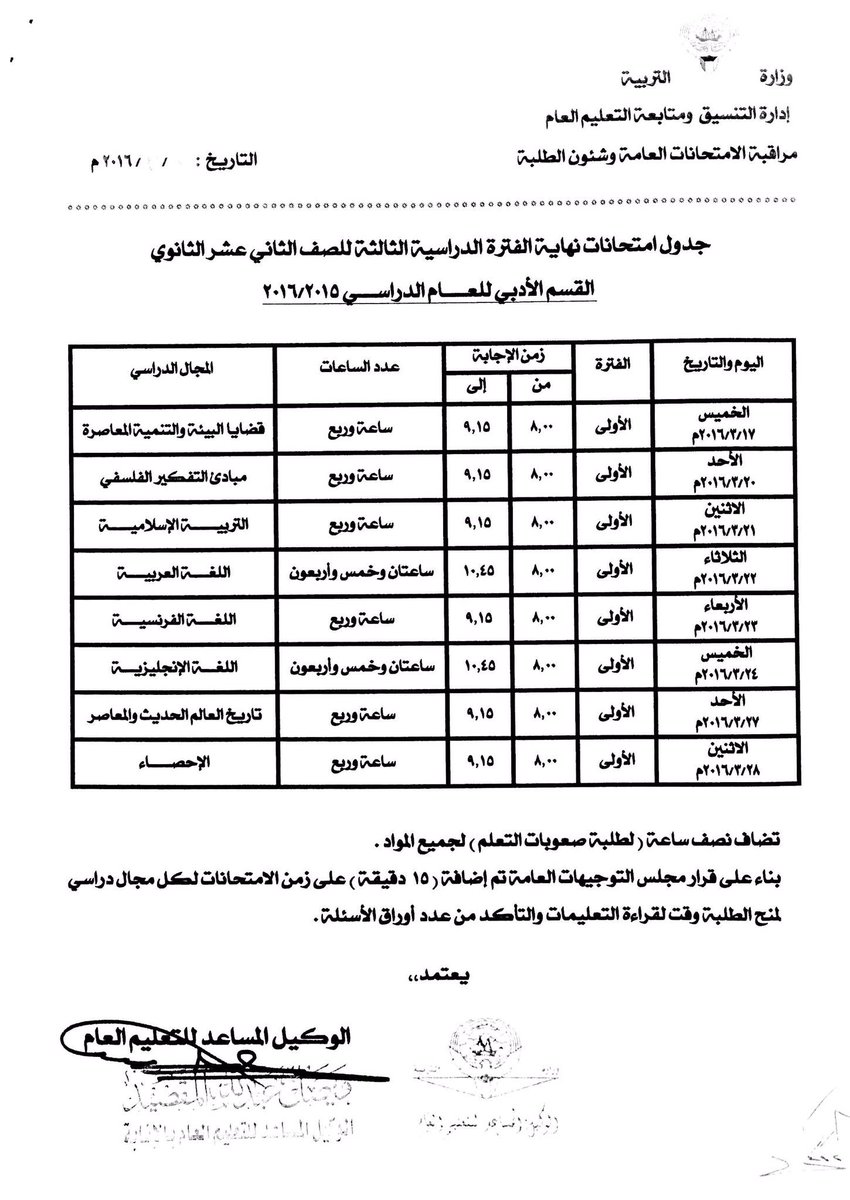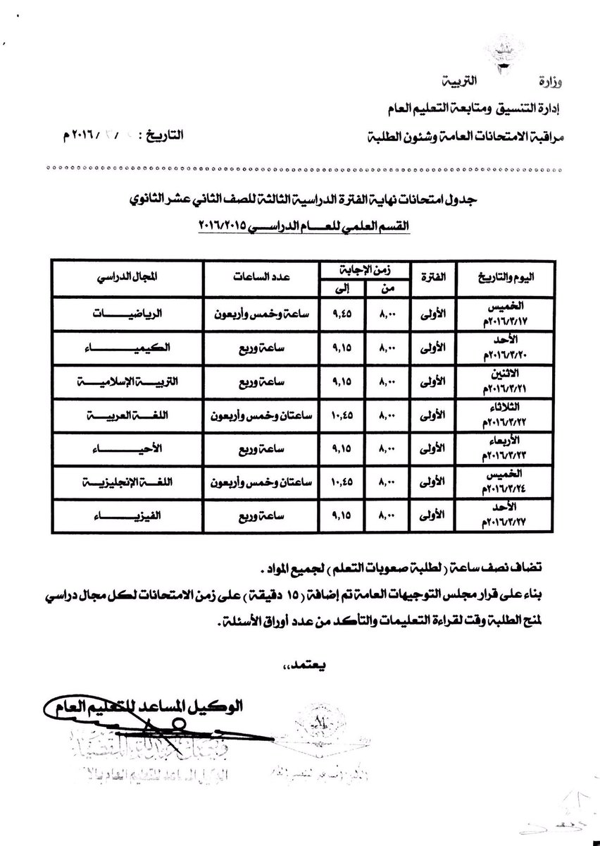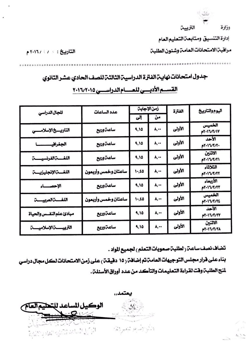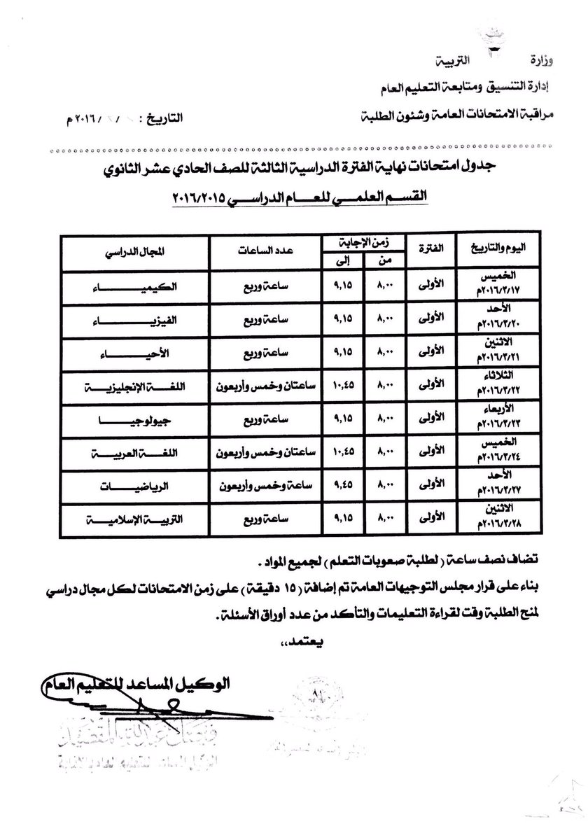 جدول امتحانات نهاية الفترة الدراسية الثالثة للصف الثاني العشر بقسميه 2016/2015