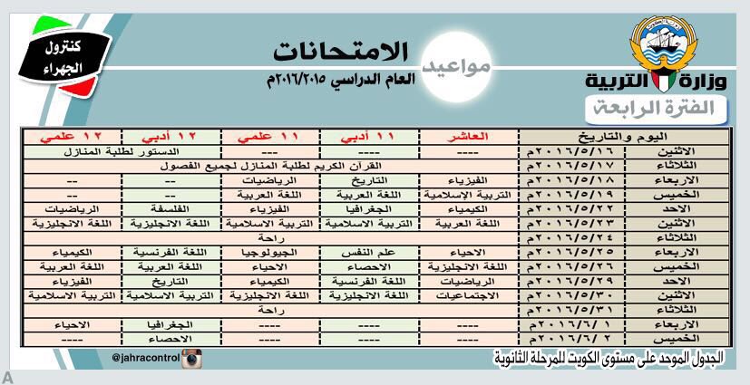 جدول امتحانات نهاية الفترة الدراسية الرابعة للمرحلة الثانوية 2016/2015 - إعداد كنترول الجهراء