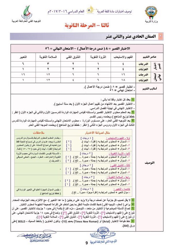 توزيع درجات #اللغة_العربية للصف العاشر والحادي عشر و الثاني عشر