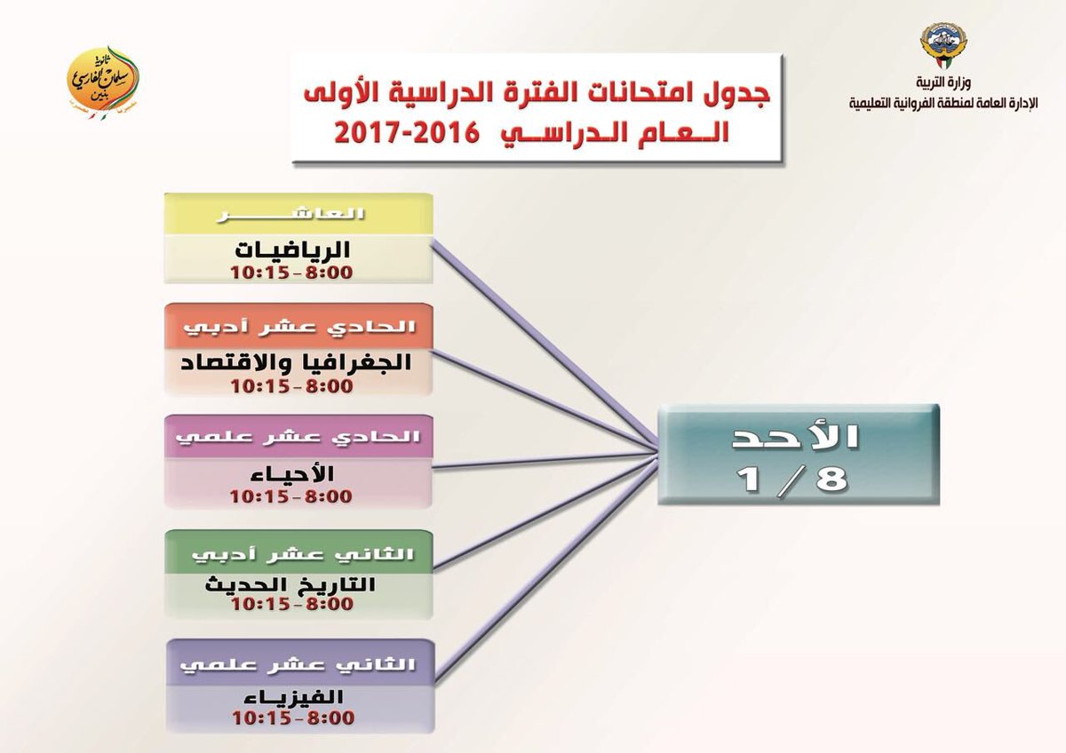 ثانوية سلمان الفارسي @s_alfarisi_kwجدول امتحانات الثانوي يوم الاحد 8/1/2017 ١ ردّ٩ إعادات تغريد٢٥ إعجابردّ ١ إعادة تغريد ٩ تفضيل ٢٥ المزيد - ثانوية سلمان الفارسي أعاد تغريد