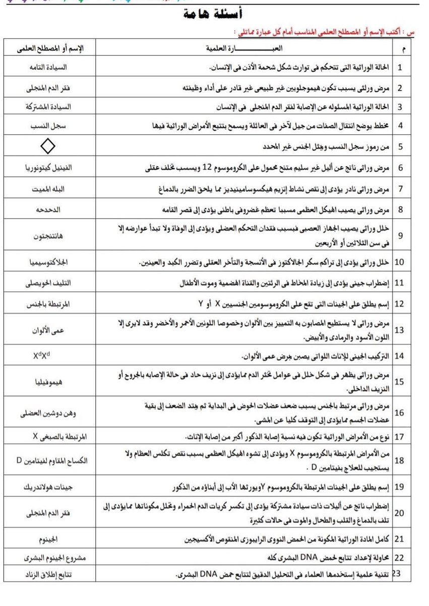 المراجعة النهائية الأحياء الصف الثاني عشر علمي وشرح وحل بنود الامتحان وأهم الاسئلة المتوقعة