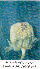 يظهر عليها النمو الأبيض للفطر ويؤدى المرض إلى تعفن الثمار وإتلافها ، المرض غالباً ما يظهر قبل الإثمار