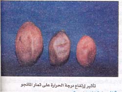 ووجد أن انخفاض درجة الحراة أثناء فترة التزهير والعقد والإخصاب يؤدى إلى تساقط الأزهار والعقد الصغير أو يؤدى إلى تكوين ثمار صغيرة الحجم مجهضة الجنين تظل معلقة على الشجرة وتنمو ببطء حتى تصل إلى النضج وهذه مايطلق عليها الثمار الفص وتكون أصغر من الثمار العادية وأشد منها حلاوة وتتقارب فى موعد النضج مع الثمار العادية وتظهر هذه الظاهرة فى أصناف العويس - السكرى - قلب الثور - نيلم .