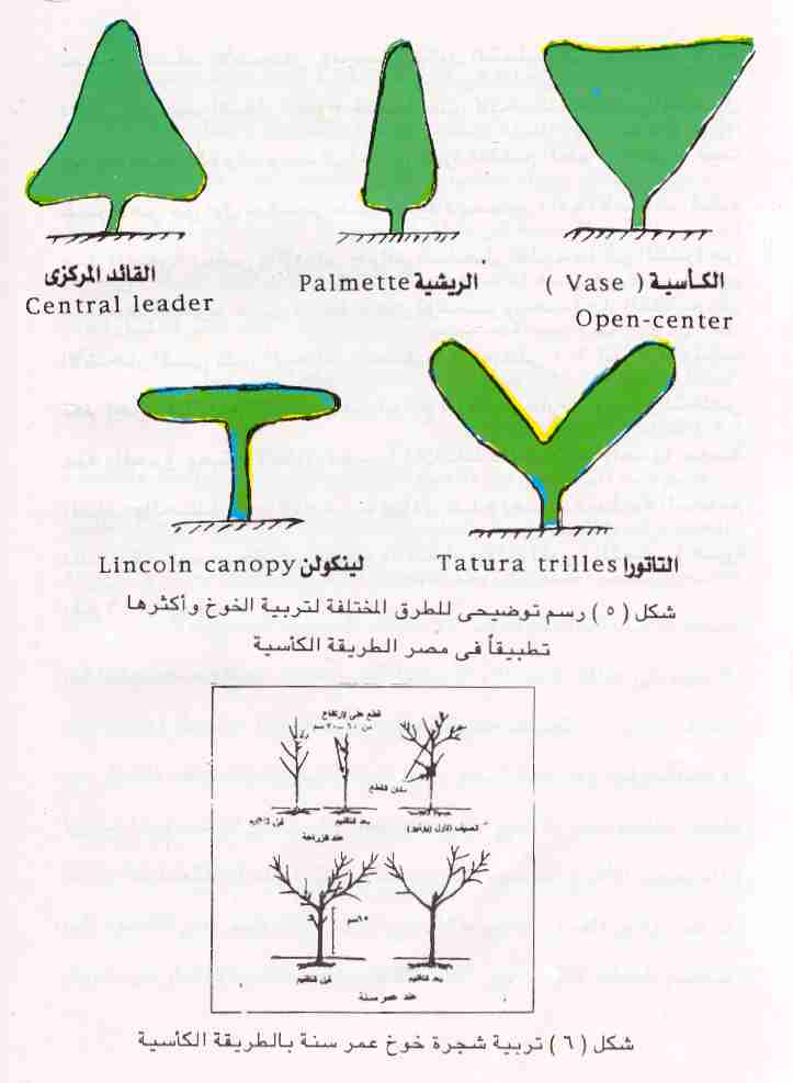 هناك الكثير من طرق التربية ( شكل 5 ) للخوخ تتوقف على مسافات الزراعة والأصناف ومن طرق التربية المعروفة :