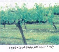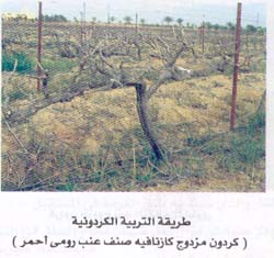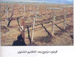 كما يمكن التربية بطريقة الكردون المزدوج عند الزراعة علي مسافة 1 - 1.5 متر بين الكرمات داخل الصف بحيث يتم وضع الكردون المزدوج للكرمة علي السلك بالتبادل مع الكرمة التي تليها في الصف في نفس المستوى بإستخدام طريقة التدعيم بالتليفون أو حرف Y ( مسافة الزراعة بين الكرمات فى أراضى الولادى لاتقل عن 1.5 متر .