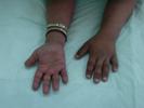 · اليد ممتلئة وصغيرة ، والكف فيه خط واحد ، والإصبع الصغير قصير ومعوّج.