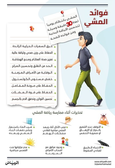 <!--الرسالة: الصورة تهدف إلى تشجيع الناس على ممارسة رياضة المشي بانتظام، مع توضيح الفوائد الصحية والتحذيرات اللازمة لضمان سلامة الممارسين.