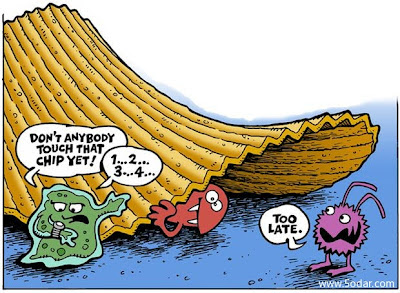 تتلوث الأطعمة التي تقع على الأرض مهما كان نوعها بأنواع مختلفة من الجراثيم و الأوساخ بوقت سريع و يعتمد مدى و خطورة هذا التلوث على نوع الطعام و عدد و نوع الجراثيم التي على الأرض أكثر من الوقت الذي مكث فيه الطعام على الأرض. تقول قاعدة الخمس ثواني أنه اذا رفع الطعام عن الأرض قبل مضي الخمس ثوان عليه فهو آمن للأكل، فهل هذه القاعدة صحيحة؟