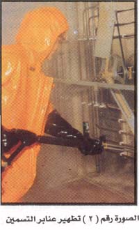 3- بعد الانتهاء من إزالة الفرشة يغسل العنبر جيداً بالماء وتستعمل خراطيم المياه القوية أو موتور رش ذو ضغط عالٍ أو موتور تنظيف بالبخار تحت ضغط عالٍ ( الصورة رقم 2 ) ويفضل وضع أحد المنظفات مع الماء ( صابون سائل أو مساحيق الغسيل المعروفة ) للمساعدة فى إزالة القاذورات التى يصعب إزالتها بالماء فقط (يجب البدء برش السقف ثم الحوائط فالشبابيك وأخيراً الأرضية) مع ملاحظة أن تزال القاذورات بعد انتهاء عملية الغسيل حتى تتم عملية التطهير التالية بكفاءة عالية .