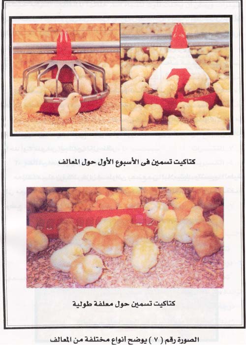 خلال 3 أيام الأولى من عمر الكتكوت تخصص أغطية المعالف أو المعالف البلاستيك بمعدل معلفة / 100 كتكوت .