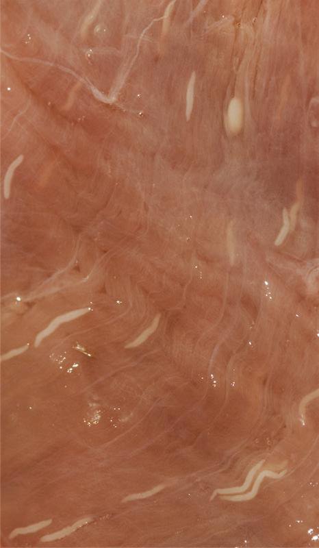 1- الفحص النسيجي للعضلات ميكروسكوبيا حيث يلاحظ أن الحويصلة تتركب من جدار خارجي ذو بنية خاصة ومقسمة بحواجز إلى حجيرات وتحتوي على عدة آلاف من البراديزويت . و هذه صورة لحويصلة مصبوغة بصبغةH&E