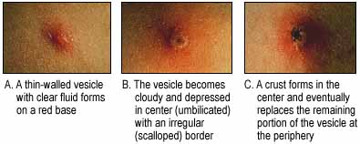 بعد يومين او ثلاث ايام من العدوى تختفي الحرارة ثم تعود ثانيا ويتطور الطفح الجلدي و يتحول الى بثور( في حجم حبة العدس) ثم الى بثور بها قيح ثم تنفجر و تتحول الى قرح مفتوحة الحواف تتحول إلى قشور فيما بعد او تمتص و تتصلب وتتحول الى قشور جافة و التي تسقط على الارض بعد 7_10 ايام تاركة و رائها اثار التئام.