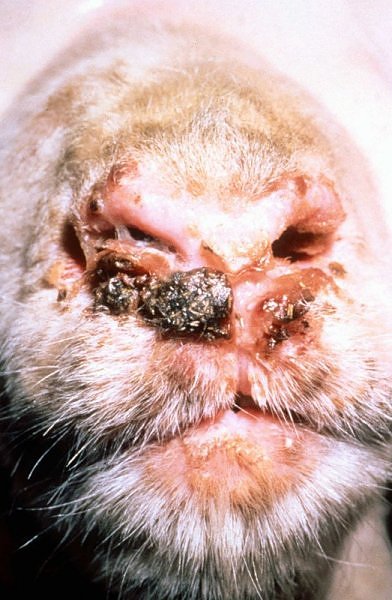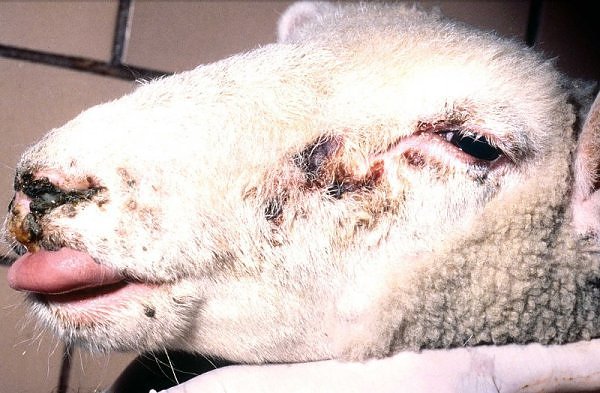 الطفح الجلدي يبدأ في الظهور على شكل حبيبات صغيرة حمراء حيث ينتشر على جلد المناطق الخالية من الصوف مثل منطقة ما بين الفخذين والصفن والضرع وباطن الذيل و منطقة الإبط والمخطم و الوجه و الفم كما ينتشر على الأغشية المخاطية لتجويف الفم وللجهازين الهضمي و التنفسي وللمهبل