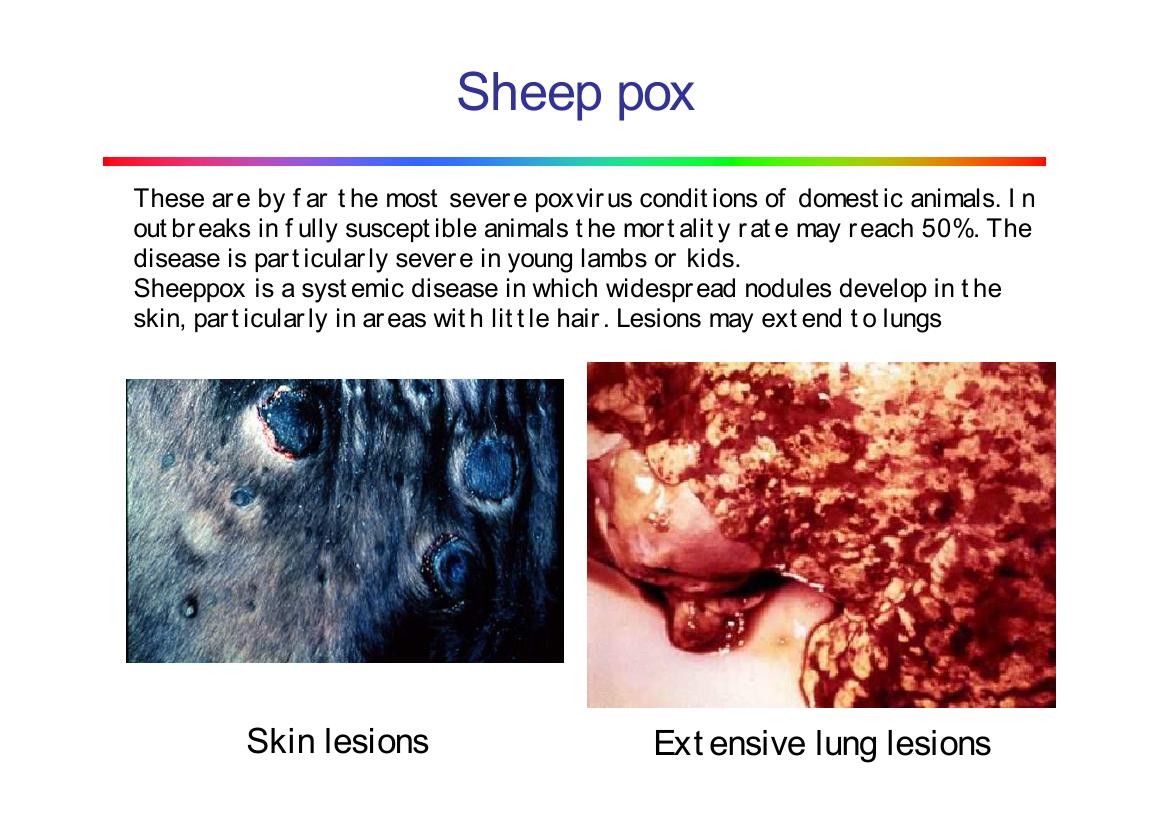 نتقل العدوى الى الحيوان و تحدث الاصابة حيث ينتشر الفيروس في الدم ونتيجة لذلك تظهراعراض حمى على الحيوان ثم يتمركز الفيروس في انسجة الجسم و بخاصة الجلد و يحدث اصابات الجدري المميزة حيث تبدا على شكل طفح الجلدي ثم يتحول ل بقع صغيرة حمراء مع أوديما خفيفة حولها "Macules"(الطور الوردي) تتحول إلى فقاعات وانتفاخات Papules""(الطور الحلمي) ثم إلى عقد ثم حويصلات مائيةثم الى بثرات ثم بثرات صديدية توجد في منتصفها تنخرات(الطور البثري) ثم أخيرا ً قشور جافة داكنة اللون و هي اخطر الانواع حيث تتعلق القشور بالصوف و تكون مصدرا للعدوى. (الطور الحويصلي )نادر الحدوث وبعض العقد قد تتطور لتصبح كتلا أكبر حجما كعقد التهاب الجلد العقدي. الآفات على الأغشية المخاطية للأنف والمهبل تتآكل وتتقرح.
