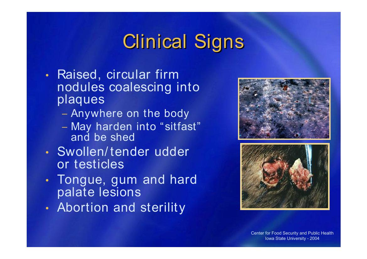 يتميز المرض بارتفاع مفاجئ في درجة الحرارة 40– 41م° قد يستمر لمدة 14 يوم وغالبا ما يكون ذو مرحلتين ويصحب ذلك الامتناع عن الأكل و تظهر عقد جلدية بعد بداية المرحلة الثانية من الحمى أسفل الشرج والأعضاء التناسلية والضرع وقد يمتد ليشمل معظم أنحاء جسم الحيوان.